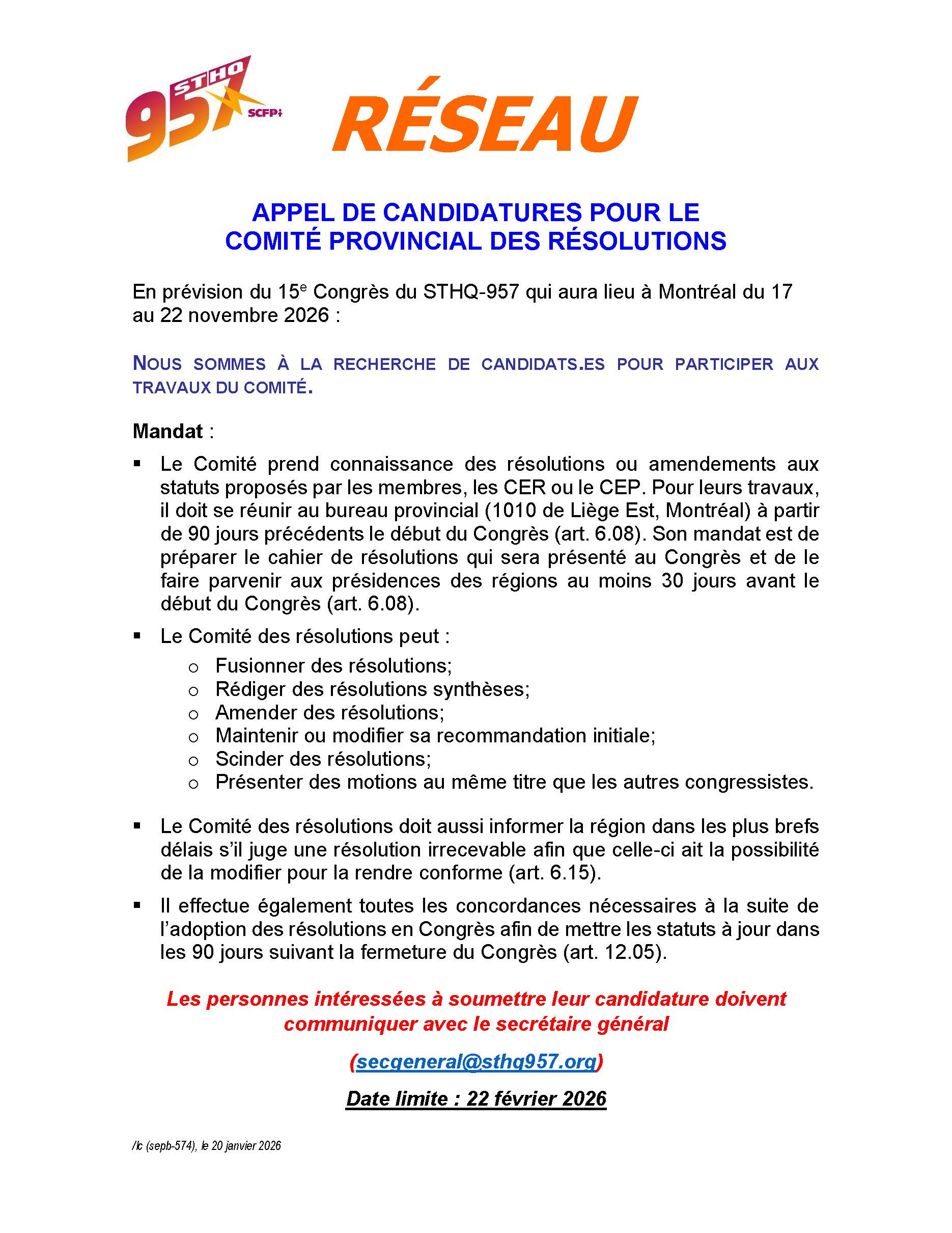 RÉSEAU 957 - APPEL DE CANDIDATURES POUR LE COMITÉ PROVINCIAL DES RÉSOLUTIONS